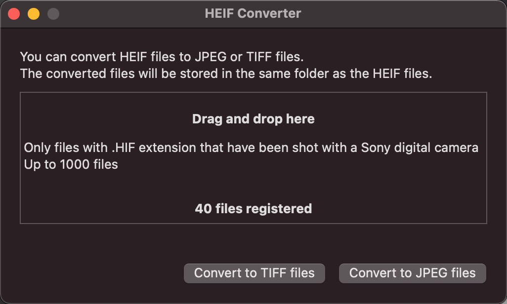 HEIF Converter는 지원되는 Sony 카메라를 사용하여 촬영한 HEIF 파일을 JPEG 또는 TIFF 파일로 변환하는 응용 프로그램입니다.